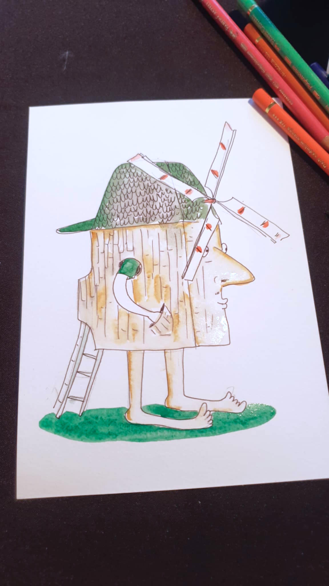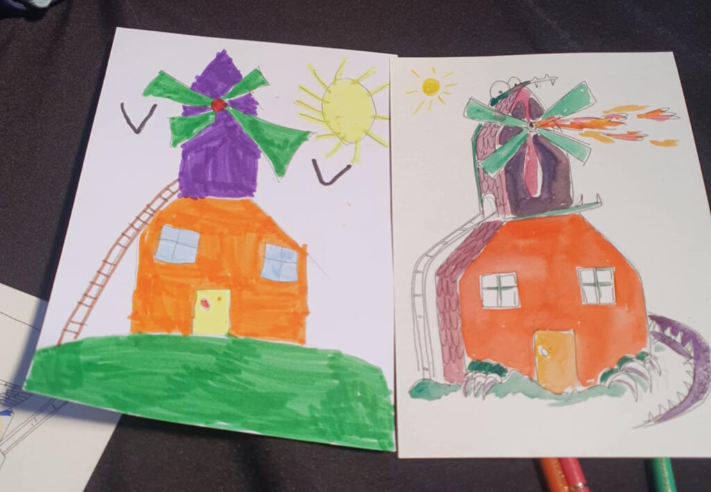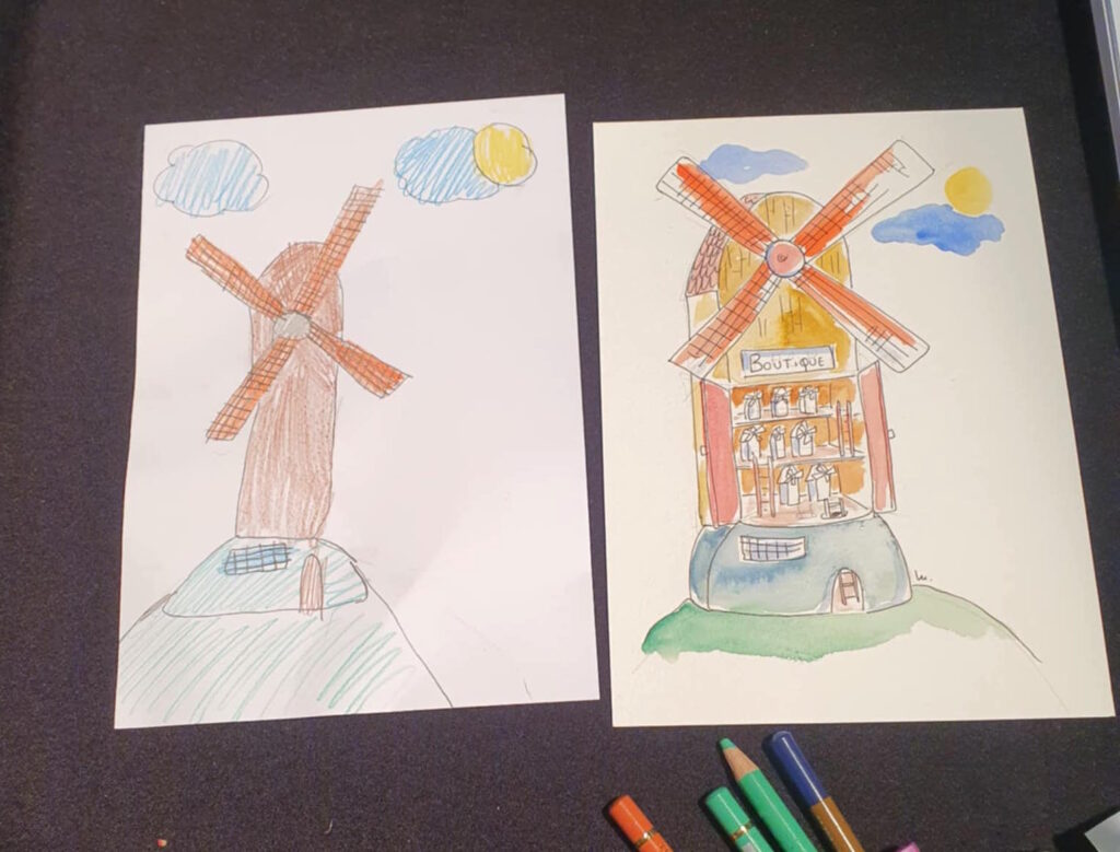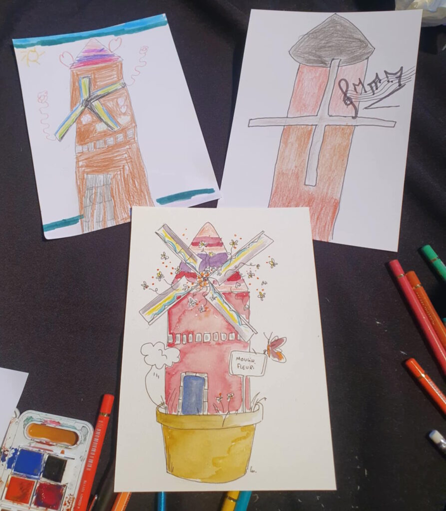 Un dimanche après midi avec plusieurs illustrateurs, nous avons dessiné des Moulins à 4 mains : Un enfant arrive avec son dessin et en discutant avec lui on le lui redessine en y ajoutant pleins de détails.