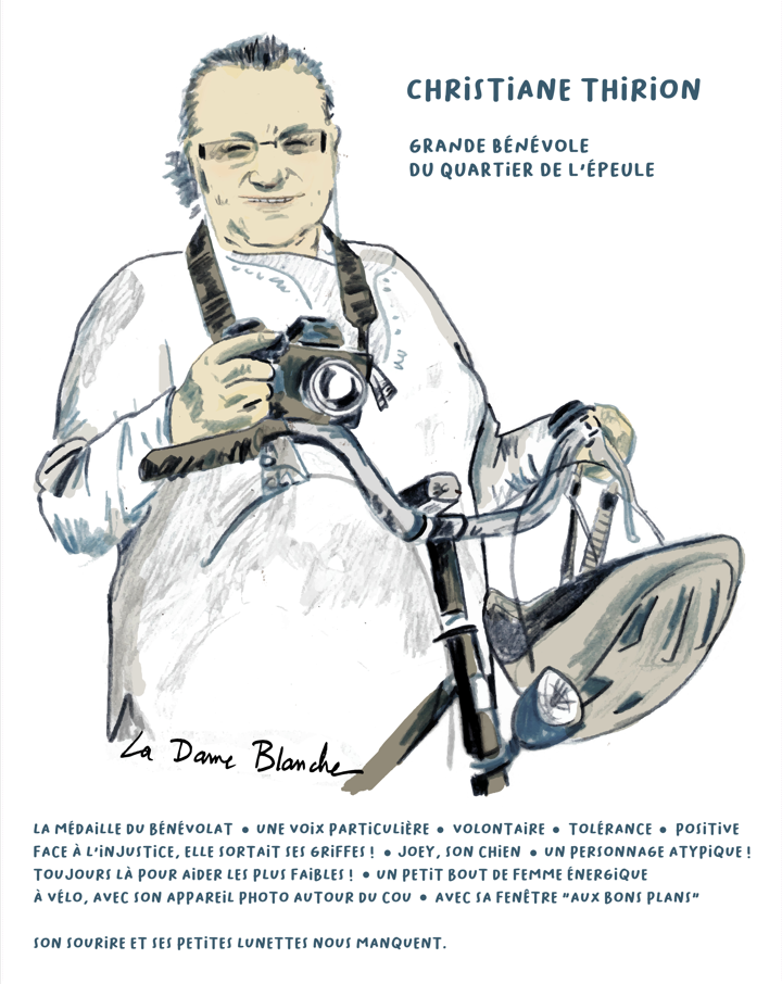 Elle était bien connue dans le quartier de l’Epeule. Christiane Thirion, très engagée au niveau associatif et dévouée aux autres, toujours prête à rendre service, a laissé un grand vide dans le quartier. Surnommée la « dame blanche » car toujours habillée en blanc, elle sillonnait le quartier sur son vélo et immortalisait tous les moments forts avec son appareil photo.